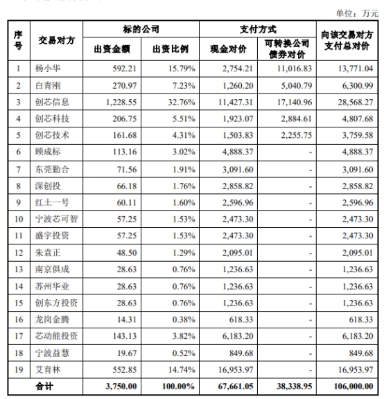 公司以发行可转换公司债券及支付现金相结合的方式向杨小华等19名交易对方支付对价,其中杨小华、白青刚、创芯信息、创芯科技、创芯技术5名交易对方获得的对价中18,868.62万元以现金方式支付,剩余38,338.95万元以可转换公司债券的方式支付,其余交易对方均以现金对价支付。根据交易双方协商结果,本次交易中,公司结合交易谈判情况、交易对方初始取得成本等因素,对交易对方所持标的公司股权采取差异化定价。公司向杨小华等19名交易对方发行可转换公司债券及支付现金的比例安排明细如下: