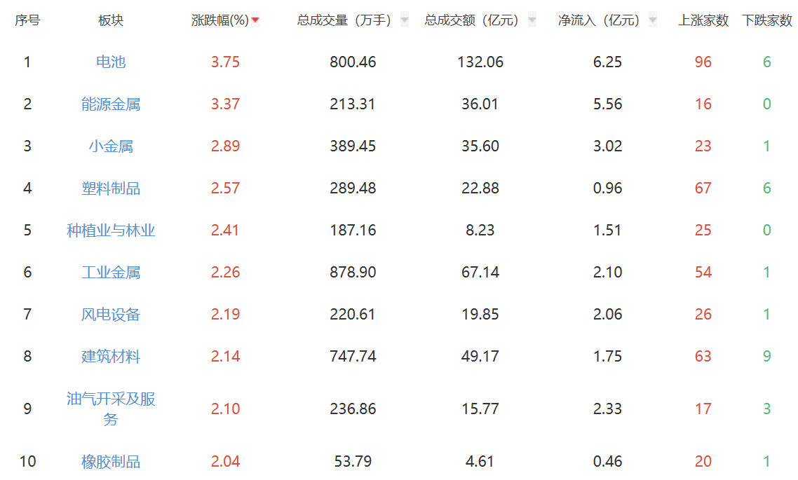 板块方面,固态电池、能源金属板块涨幅居前,教育、公路铁路运输、白酒板块跌幅居前。