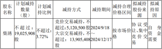因自身资金需要,公司持股5%以上的股东、副董事长兼总经理柴琇拟自公告披露之日起15个交易日后的3个月内(窗口期不减持)以集中竞价和大宗交易方式合计减持公司股份不超过19,025,908股(不超过公司目前股份总数的3.72%,其中,以集中竞价交易方式取得的股份不超过3,664,336股、不超过公司目前股份总数的0.72%),减持价格按市场价格确定。