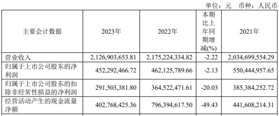2023年,燕东微实现营业收入21.27亿元,同比下降2.22%;归属于上市公司股东的净利润4.52亿元,同比下降2.13%;归属于上市公司股东的扣除非经常性损益的净利润2.92亿元,同比下降20.03%;经营活动产生的现金流量净额为4.03亿元,同比下降49.43%。