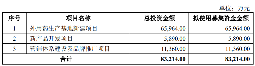 小方制药本次发行募集资金总额49,880.00万元,扣除发行费用后的募集资金净额为44,821.73万元,公司最终募集资金净额比原计划少38,392.27万元。小方制药2024年8月21日披露的招股说明书显示,公司拟募集资金83,214.00万元,用于外用药生产基地新建项目、新产品开发项目、营销体系建设及品牌推广项目。