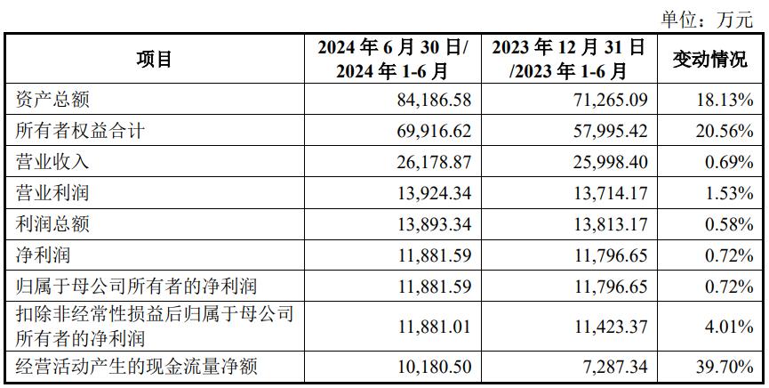 2024年1-6月,小方制药实现营业收入26,178.87万元,同比增长0.69%;净利润/归属于母公司所有者的净利润11,881.59万元,同比增长0.72%;扣除非经常性损益后归属于母公司所有者的净利润11,881.01万元,同比增长4.01%;经营活动产生的现金流量净额10,180.50万元,同比增长39.70%。