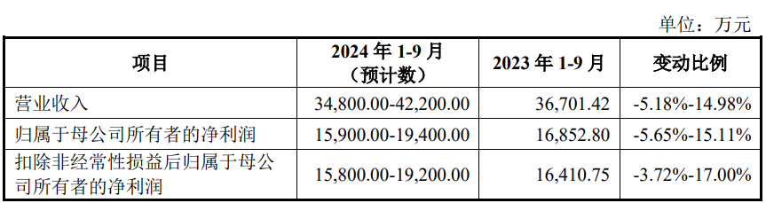 结合当前市场及公司实际经营情况,公司预计2024年1-9月营业收入为34,800.00万元至42,200.00万元,变动比例-5.18%至14.98%;归属于母公司所有者的净利润15,900.00万元至19,400.00万元,变动比例-5.65%至15.11%;扣除非经常性损益后归属于母公司所有者的净利润15,800.00万元至19,200.00万元,变动比例-3.72%至17.00%。