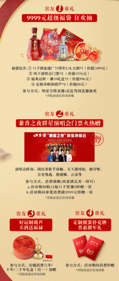 超级福袋包括:口子酒业建厂75周年庆2.5L大酒*1,窖友纪念收藏两相宜;口子窖兼香之夜群星演唱会门票*2,国民天王&一线歌手超强阵容,为窖友点燃一场音乐与美酒的盛宴;口子窖福来运转·兼10礼盒*2,窖友中秋团圆送礼佳选;口子窖定制采购铜葫芦*2,好酒送福禄。