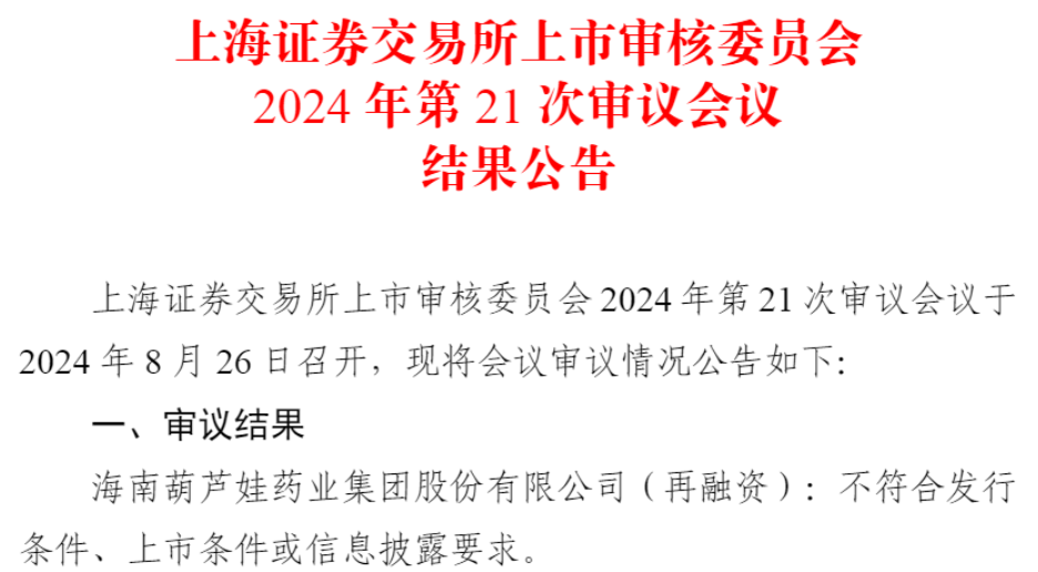 中国经济网北京8月27日讯 上交所上市审核委员会2024年第21次审议会议于2024年8月26日召开,审议结果显示,海南葫芦娃药业集团股份有限公司(股票简称:葫芦娃,股票代码:605199.SH)再融资不符合发行条件、上市条件或信息披露要求。