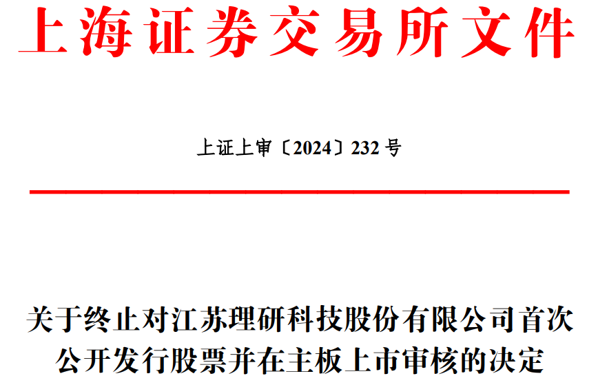 上交所于2023年6月30日依法受理了理研股份首次公开发行股票并在主板上市的申请文件,并按照规定进行了审核。日前,理研股份和保荐人国金证券股份有限公司向上交所提交了《江苏理研科技股份有限公司关于撤回首次公开发行股票并在沪市主板上市申请文件的申请报告》和《关于撤回江苏理研科技股份有限公司首次公开发行股票并在沪市主板上市申请文件的申请报告》,申请撤回申请文件。根据《上海证券交易所股票发行上市审核规则》第六十三条的有关规定,上交所决定终止对理研股份首次公开发行股票并在主板上市的审核。