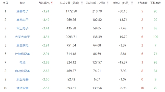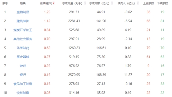 板块方面,生物制品、建筑装饰、煤炭开采加工等涨幅居前,消费电子、其他电子、军工电子等跌幅居前。