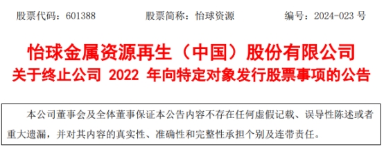 中国经济网北京8月28日讯 怡球资源(601388.SH)昨晚披露了关于终止公司2022年向特定对象发行股票事项的公告。