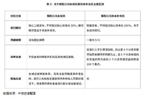 保险公司永续债与保险公司资本补充债券的主要区别在于偿付顺序、到期期限、利率规则、附加条款等方面。对比来看,保险公司永续债次级属性明显更强,更适合信用情况较好的国有大型保险公司,而部分偿付能力承压的中小保险公司预计永续债发行存在一定困难。