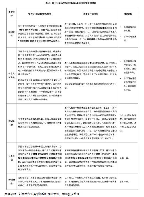 保险公司永续债和商业银行永续债作为资本补充工具,在吸收风险损失方面无明显差异,特别是对于当下发行永续债的优质银行和优质保险公司,风险损失的可能性极低。因此仅通过对比二者在发行条款上的差异,来助力投资人判断保险公司永续债风险定价。具体而言,二者差异主要集中在于赎回条款、利息支付条款和减记条款三个方面。三个方面的设置相较于其他行业债券具有明显的投资者不利效应,但考虑到当前发行人具有极强信用水平,投资者基本接受、发行者基本沿用了该类条款设置。