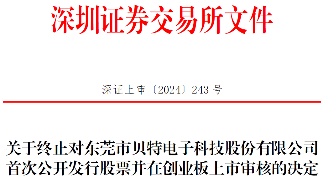 深交所于2023年6月27日依法受理了贝特电子首次公开发行股票并在创业板上市的申请文件,并依法依规进行了审核。日前,贝特电子向深交所提交了《东莞市贝特电子科技股份有限公司关于撤回首次公开发行股票并在创业板上市申请文件的申请》,保荐人向深交所提交了《民生证券股份有限公司关于撤回东莞市贝特电子科技股份有限公司首次公开发行股票并在创业板上市申请文件的申请》。根据《深圳证券交易所股票发行上市审核规则(2024年修订)》第六十二条的有关规定,深交所决定终止对贝特电子首次公开发行股票并在创业板上市的审核。