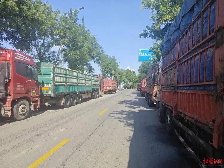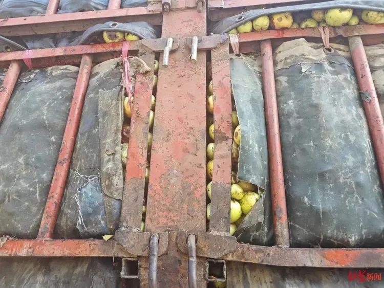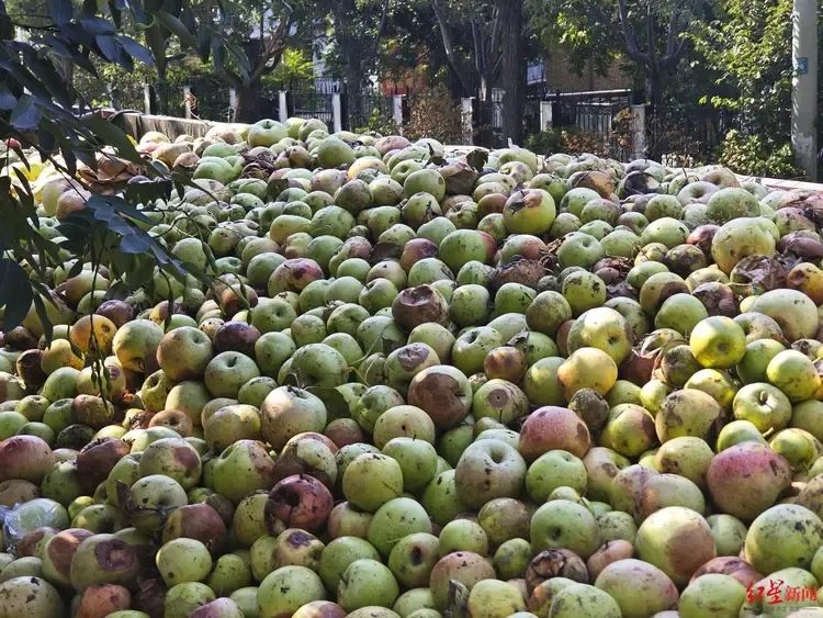 图片来源:红星新闻记者登上其中四辆货车的车顶,放眼望去,不少苹果已经腐烂。由于天气炎热,苹果腐烂散发的气味更加明显。
