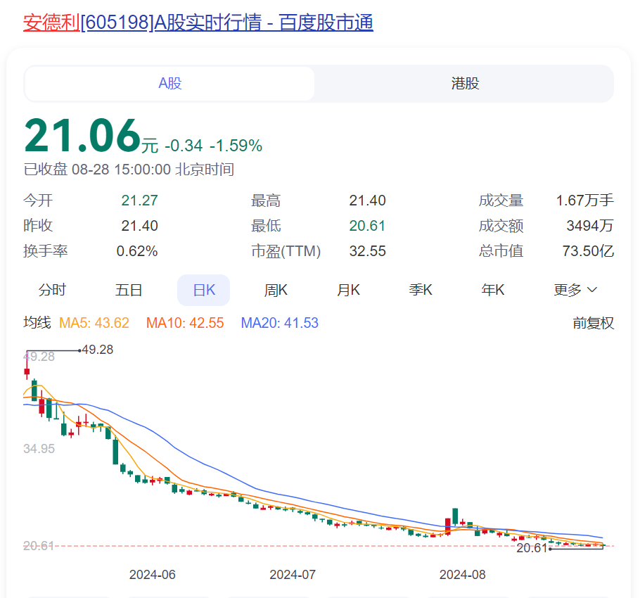 截至8月28日收盘,安德利股价报收21.06元,跌1.59%,较年中高点49.28元已跌了超过一半,总市值73.5亿元。