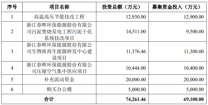 春晖能源原拟在上交所主板本次公开发行股票不超过2,886.70万股,发行完成后公开发行股份数占发行后总股数的比例不低于25%,不涉及原股东公开发售股份的情形。春晖能源原拟募集资金69,100.00万元,用于高温高压节能技改工程、浙江春晖环保能源股份有限公司污泥焚烧发电工程污泥干化系统技改项目、浙江春晖环保能源股份有限公司生物质再生能源研发中心建设项目、浙江春晖环保能源股份有限公司压缩空气集中供应项目、补充流动资金、购买办公楼。