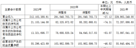 2023年年度报告(更正后)显示,去年,公司实现营业收入2.12亿元,同比下降27.12%;归母净利润2115.31万元,同比下降74.31%;扣非净利润1332.17万元,同比下降83.07%;经营活动产生的现金流量净额为5529.64万元,同比下降46.32%。