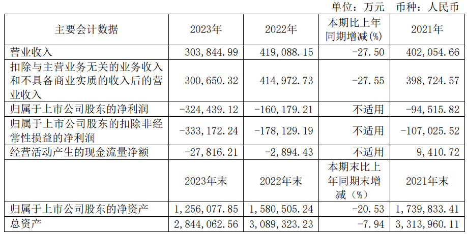 2023年,和辉光电实现营业收入30.38亿元,同比下降27.50%;归属于上市公司股东的净利润-32.44亿元,2022年为-16.02亿元;归属于上市公司股东的扣非净利润-33.32亿元,2022年为-17.81亿元;经营活动产生的现金流量净额为-2.78亿元,2022年为-2894.43万元。