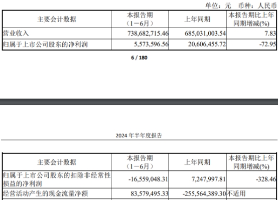 中国经济网北京8月30日讯 中自科技(688737.SH)昨晚披露的2024年半年度报告显示,公司上半年实现营业收入7.39亿元,同比增长7.83%;归属于上市公司股东的净利润557.36万元,同比下降72.95%;归属于上市公司股东的扣除非经常性损益的净利润-1655.90万元,上年同期为724.80万元;经营活动产生的现金流量净额为8357.95万元,上年同期为-2.56亿元。
