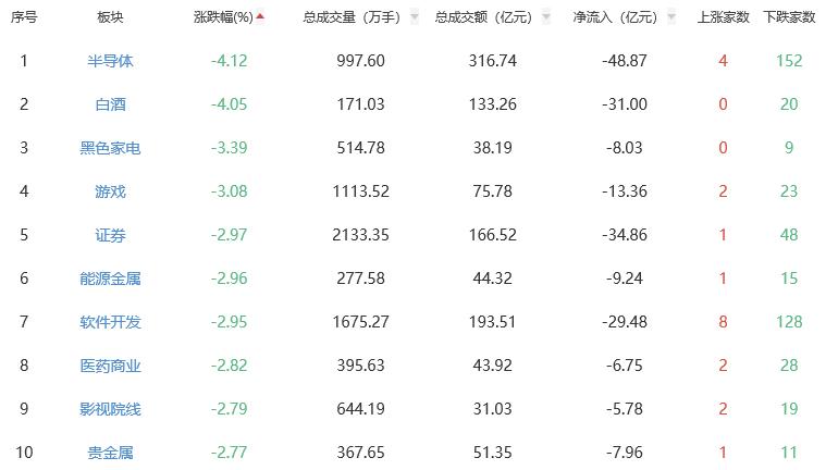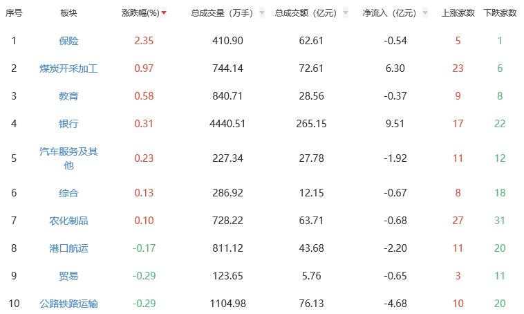 板块方面,保险、煤炭开采加工、教育等涨幅居前,半导体、白酒、黑色家电等跌幅居前。