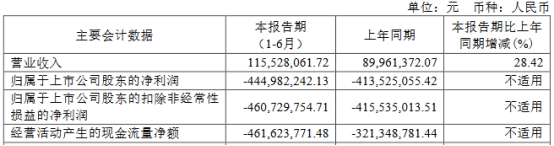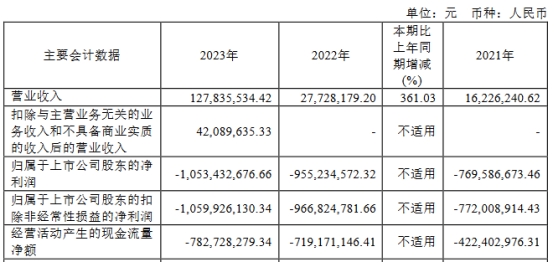 2023年,公司实现营业收入1.28亿元,同比增长361.03%;归母净利润为-10.53亿元,上年同期为-9.55亿元;扣非净利润为-10.60亿元,上年同期为-9.67亿元;经营活动产生的现金流量净额为-7.83亿元,上年同期为-7.19亿元。