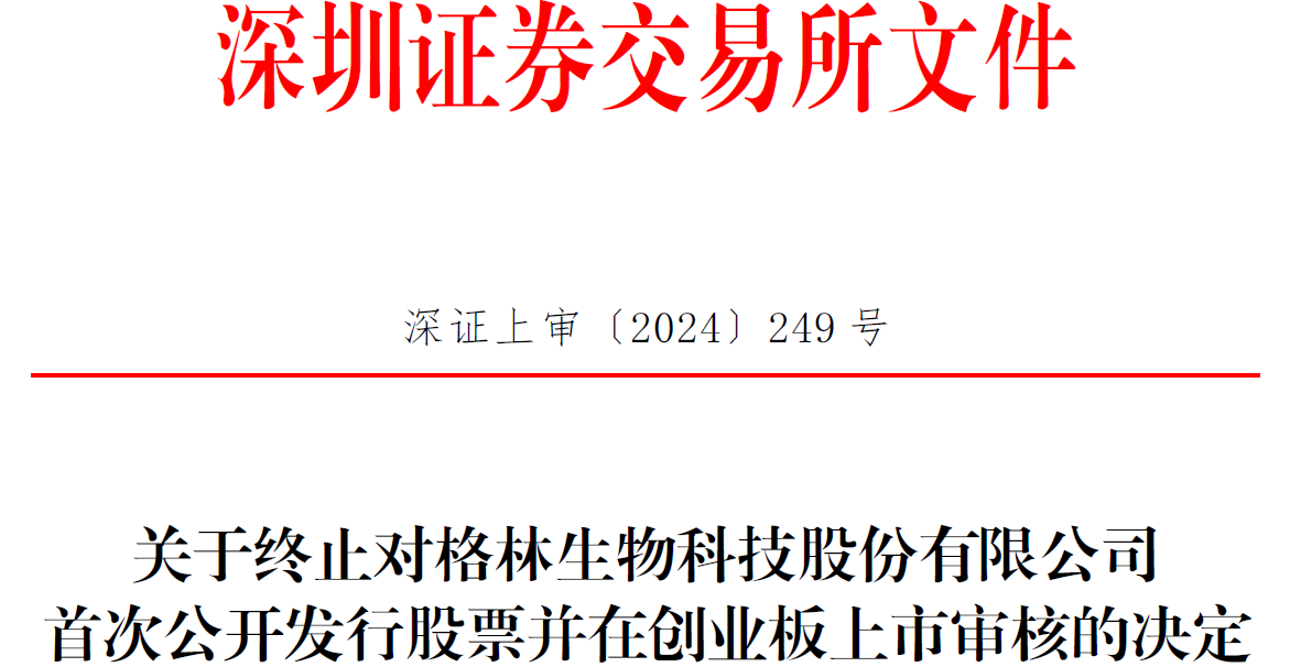 深交所于2023年6月2日依法受理了格林生物首次公开发行股票并在创业板上市的申请文件,并依法依规进行了审核。日前,格林生物向深交所提交了《关于撤回首次公开发行股票并在创业板上市申请文件的申请》,保荐人向深交所提交了《长江证券承销保荐有限公司关于撤回格林生物科技股份有限公司首次公开发行股票并在创业板上市申请文件的申请》。根据《深圳证券交易所股票发行上市审核规则(2024年修订)》第六十二条的有关规定,深交所决定终止对格林生物首次公开发行股票并在创业板上市的审核。