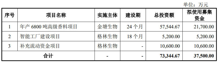 格林生物原拟在深交所创业板公开发行股票数量不超过1,888.8889万股,原股东不公开发售股份,本次公开发行后的流通股数量占公司股份总数的比例不低于25%。格林生物原拟募集资金37,500.00万元,用于年产6800吨高级香料项目、智能工厂建设项目、补充流动资金项目。