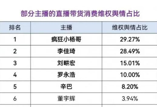 今年4月24日,北京阳光消费大数据研究院联合对外经济贸易大学消费者保护法研究中心、消费者网等机构发布了《直播带货消费维权舆情分析报告》(以下简称《报告》),《报告》显示,2022年直播带货消费维权舆情主要反映了产品质量、虚假宣传、不文明带货、价格误导、发货、退换货、销售违禁商品以及诱导场外交易等八方面问题,该报告选取疯狂小杨哥、李佳琦、刘畊宏、罗永浩、辛巴、董宇辉等主播作为重点分析对象得出消费维权舆情占比,其中疯狂小杨哥的维权舆情占比为29.27%,辛巴则占了8.2%。