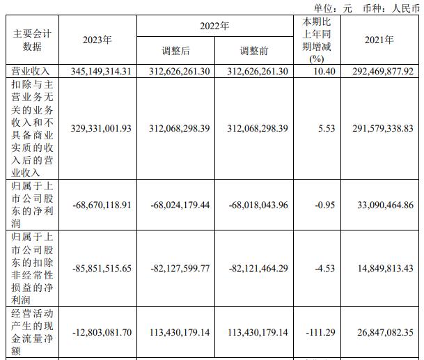 2023年,方邦股份实现营业收入3.45亿元,同比增长10.40%;实现归属于上市公司股东的净利润-6867.01万元,上年同期为-6802.42万元;实现归属于上市公司股东的扣除非经常性损益的净利润-8585.15万元,上年同期为-8212.76万元;经营活动产生的现金流量净额为-1280.31万元。