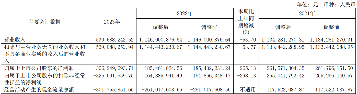 2023年,东芯股份实现营业收入5.31亿元,同比下滑53.70%;归属于上市公司股东的净利润-3.06亿元,同比下滑265.13%;归属于上市公司股东的扣除非经常性损益的净利润-3.27亿元,同比下滑298.13%;经营活动产生的现金流量净额-3.02亿元,上年同期为-2.61亿元。