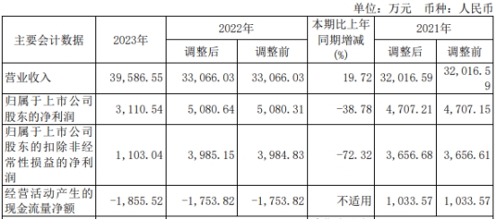 2023年,公司实现营业收入3.96亿元,同比增长19.72%;归属于上市公司股东的净利润3,110.54万元,同比下降38.78%;归属于上市公司股东的扣除非经常性损益的净利润为1,103.04万元,同比下降72.32%;经营活动产生的现金流量净额为-1,855.52万元,上年同期为-1,753.82万元。