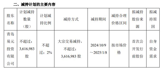 公司股东易元投资基于自身资金需求,拟通过大宗交易方式,合计减持公司股份不超过总股本的2%,将于本公告披露之日起15个交易日后的三个月内进行。若此期间公司有送股、转增股本、增发新股或配股等股份变动事项,则易元投资可对本次拟减持股份数量和比例进行相应调整。上述减持方式由易元投资根据实际情况执行,减持价格将按照减持实施时的市场价格及相关规定确定。