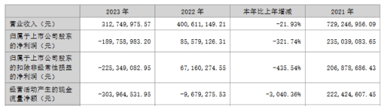 2023年,公司实现营业收入3.13亿元,同比下降21.93%;归母净利润为-1.90亿元,上年同期为8557.91万元;扣非净利润为-2.25亿元,上年同期为6716.03万元;经营活动产生的现金流量净额为-3.04亿元,上年同期为-967.93万元。
