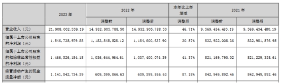 2023年,公司实现营业收入219.08亿元,同比增长46.71%;归母净利润15.47亿元,同比增长30.57%;扣非净利润14.67亿元,同比增长41.37%;经营活动产生的现金流量净额为11.41亿元,同比增长87.18%。