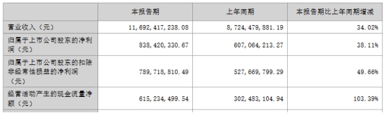 2024年上半年,公司实现营业收入116.92亿元,同比增长34.02%;归母净利润8.38亿元,同比增长38.11%;扣非净利润7.90亿元,同比增长49.66%;经营活动产生的现金流量净额为6.15亿元,同比增长103.39%。