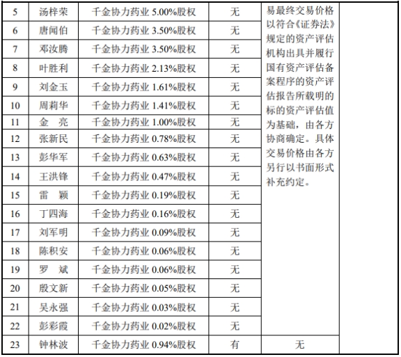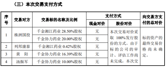 千金药业昨晚披露的发行股份及支付现金购买资产暨关联交易预案显示,公司拟通过发行股份的方式购买株洲国投、列邦康泰持有的千金湘江药业28.92%的股权,拟通过发行股份及支付现金的方式购买株洲国投和黄阳等21名自然人持有的千金协力药业68.00%的股权。本次交易完成后,千金药业持有千金湘江药业的股权比例将由51.00%提升至79.92%、持有千金协力药业的股权比例将由32.00%提升至100.00%。