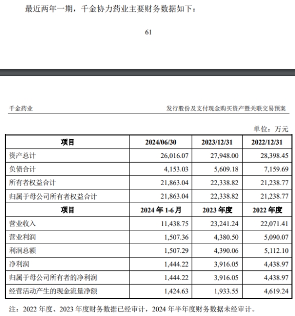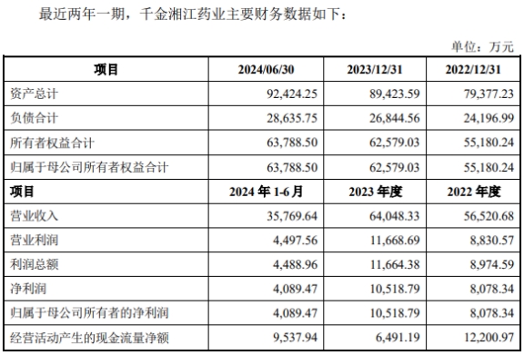本次交易前,千金湘江药业系上市公司持股51.00%的控股子公司。2022年、2023年和2024年1-6月,千金湘江药业营业收入分别为56,520.68万元、64,048.33万元和35,769.64万元,实现的净利润分别为8,078.34万元、10,518.79万元和4,089.47万元。2023年度营业收入和净利润分别同比增长13.32%和30.21%。截至2024年6月30日,千金湘江药业归属于母公司所有者权益为63,788.50万元。