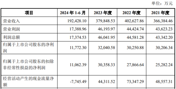 2021年至2023年及2024年1-6月,千金药业营业收入分别为366,384.46万元、402,627.86万元、379,848.53万元、192,428.10万元,归属于上市公司股东的净利润分别为30,206.34万元、30,250.88万元、32,040.58万元、11,772.30万元,归属于上市公司股东的扣除非经常性损益的净利润分别为25,282.24万元、27,866.64万元、30,358.33万元、11,062.39万元,经营活动产生的现金流量净额分别为48,557.31万元、73,347.29万元、44,311.52万元、-7,745.49万元。