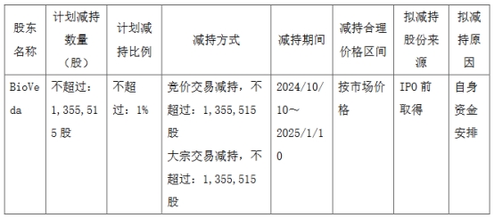 BioVeda计划通过集中竞价、大宗交易方式减持奥精医疗股份不超过1,355,515股,占奥精医疗总股份的1%。其中,通过集中竞价方式减持的,自减持计划发布之日起15个交易日之后的3个月内(2024年10月10日至2025年1月10日)实施;通过大宗交易方式减持的,自减持计划发布之日起15个交易日后的3个月内(2024年10月10日至2025年1月10日)实施。