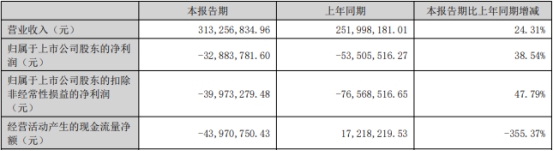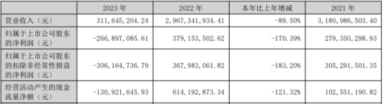 2023年,公司实现营业收入3.12亿元,同比减少89.50%;归属于上市公司股东的净利润-2.67亿元,同比减少170.39%;归属于上市公司股东的扣除非经常性损益的净利润-3.06亿元,同比减少183.20%;经营活动产生的现金流量净额-1.31亿元,同比减少121.32%。