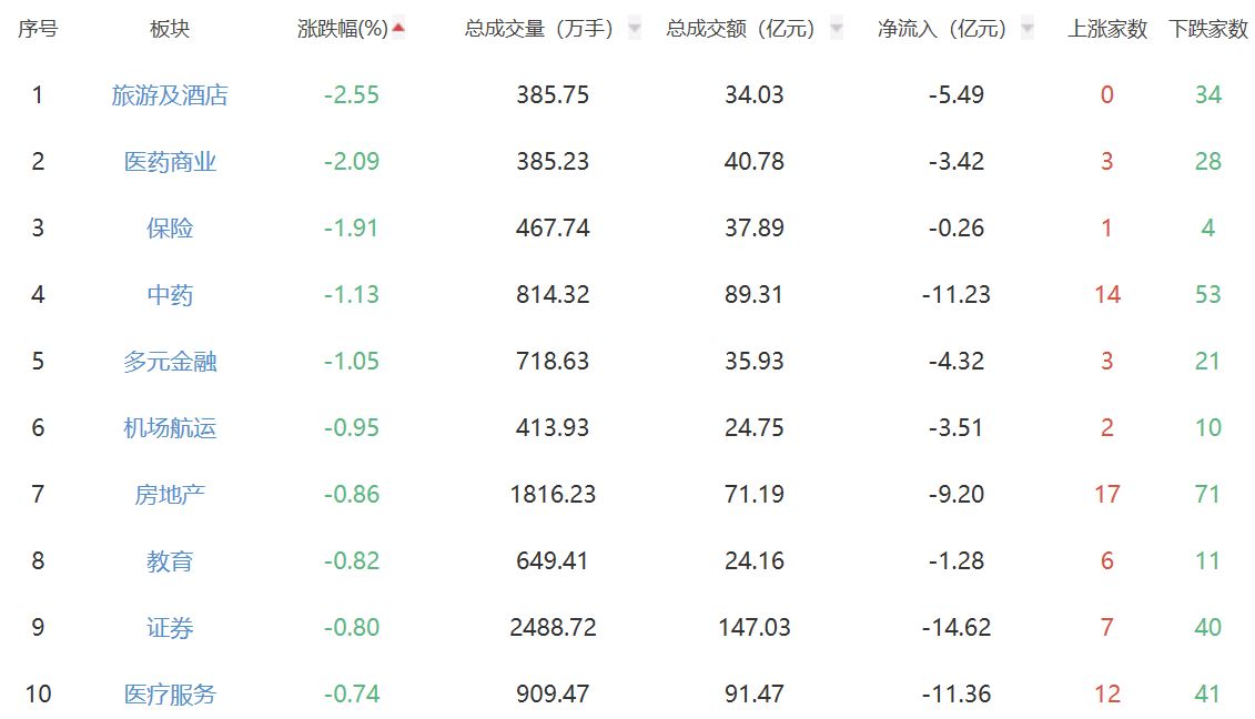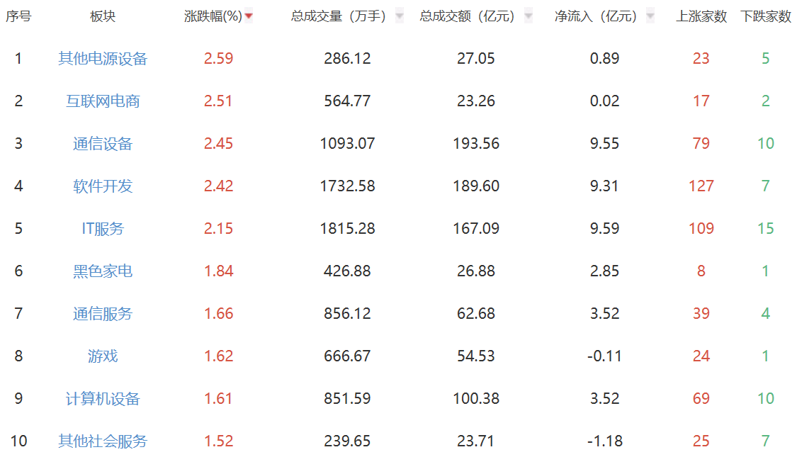 板块方面,通信设备板块午后强势,软件开发、IT服务板块涨幅居前,旅游及酒店、医药商业板块跌幅居前。