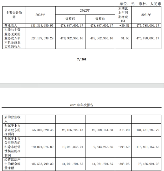 2023年,公司营业收入3.31亿元,同比下降30.81%;归属于上市公司股东的净利润-5631.08万元,上年同期2616.67万元;归属于上市公司股东的扣除非经常性损益的净利润-7002.11万元,上年同期1002.18万元;经营活动产生的现金流量净额-8553.38万元,上年同期4107.17万元。