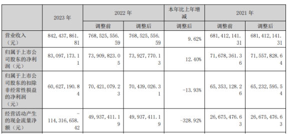 2023年,公司营业收入8.42亿元,同比增长9.62%;归属于上市公司股东的净利润8309.72万元,同比增长12.40%;归属于上市公司股东的扣除非经常性损益的净利润6062.72万元,同比下降13.93%;经营活动产生的现金流量净额为-1.14亿元,上年同期为4993.74万元。