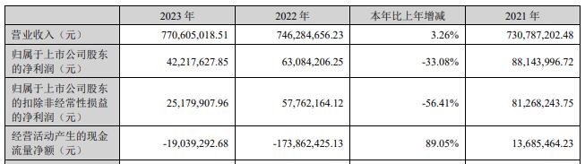 2023年,公司实现营业收入7.71亿元,同比增长3.26%;归属于上市公司股东的净利润4221.76万元,同比下降33.08%;归属于上市公司股东的扣除非经常性损益的净利润2517.99万元,同比下降56.41%;经营活动产生的现金流量净额为-1903.93万元,上年同期为-1.74亿元。
