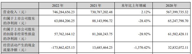2022年,公司实现营业收入7.46亿元,同比增长2.12%;归属于上市公司股东的净利润6308.42万元,同比下降28.43%;归属于上市公司股东的扣除非经常性损益的净利润5776.22万元,同比下降28.92%;经营活动产生的现金流量净额为-1.74亿元,上年同期为1368.55万元。