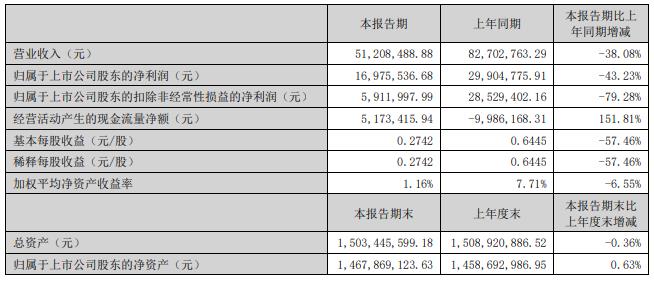 多浦乐近日发布2024年半年度报告显示,2024年上半年,多浦乐实现营业收入5120.85万元,同比下滑38.08%;归属于上市公司股东的净利润1697.55万元,同比下滑43.23%;归属于上市公司股东的扣除非经常性损益的净利润591.20万元,同比下滑79.28%;经营活动产生的现金流量净额为517.34万元。
