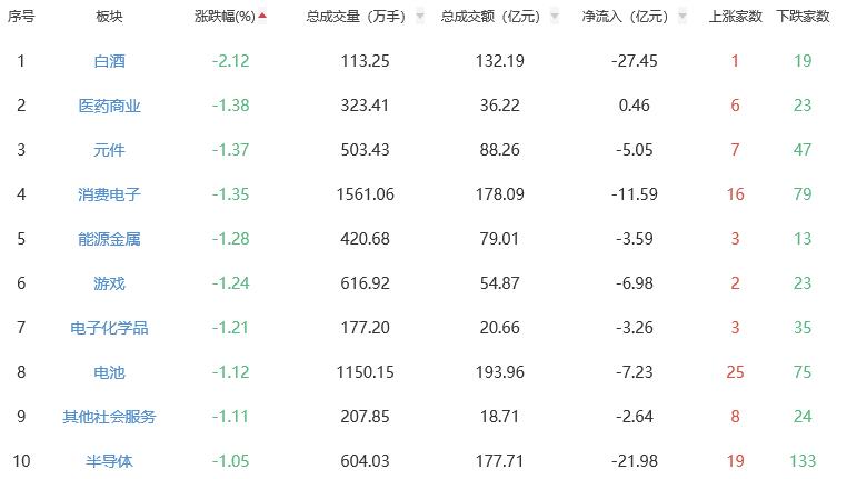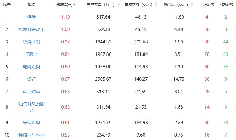 板块方面,保险、煤炭开采加工、软件开发等涨幅居前,白酒、医药商业、元件等跌幅居前。