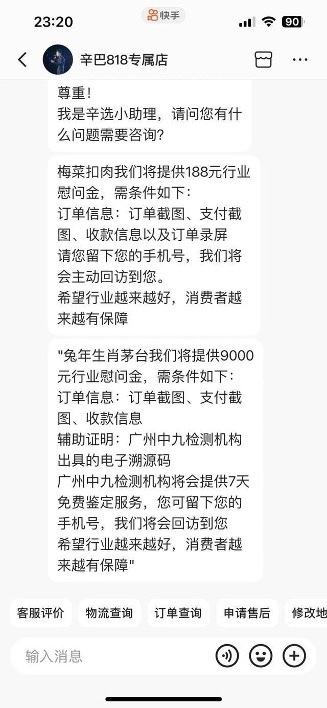 11日晚10点多,有多名网友在其账号最新视频的评论区中发布与辛选客服对话的截图。截图显示,当消费者发送“梅菜扣肉”“茅台”等关键词后,辛选客服回复将提供“行业慰问金”。