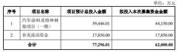 松井股份2023年12月21日发布的向不特定对象发行可转换公司债券预案(修订稿)显示,公司拟向不特定对象发行可转换公司债券募集资金总额不超过62,000.00万元(含本数),扣除发行费用后,募集资金拟用于以下项目:汽车涂料及特种树脂项目(一期)、补充流动资金。