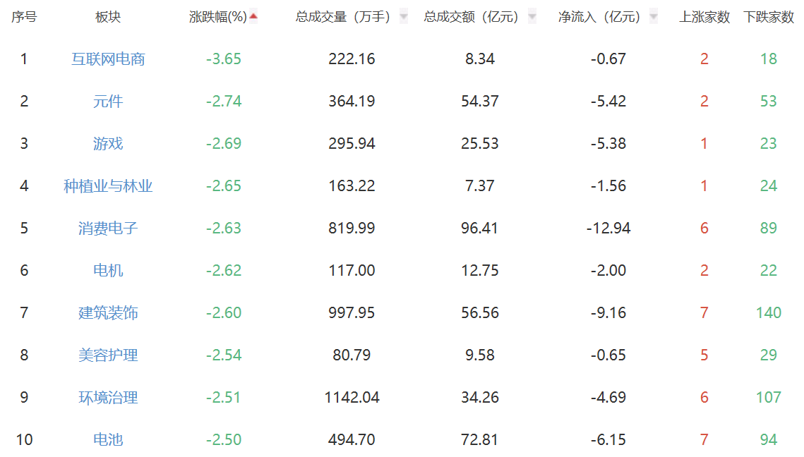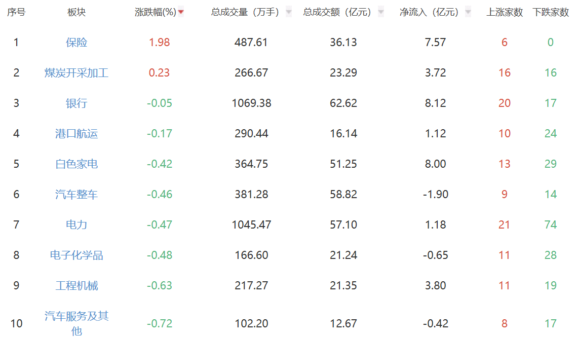 板块方面,保险、煤炭开采加工板块涨幅居前,互联网电商、游戏板块跌幅居前。