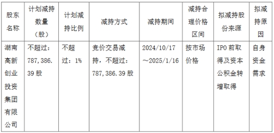 公告称,麒麟信安于2024年9月18日收到公司持股5%以上股东湖南高新创业投资集团有限公司(以下简称“湖南高新创投”)发来的《关于股份减持计划的告知函》,因股东自身资金需求,湖南高新创投计划自公告披露之日起15个交易日后的三个月内,即2024年10月17日起至2025年1月16日期间,通过集中竞价交易的方式减持公司股份合计不超过787,386.39股,合计减持比例占公司总股本的比例不超过1%。如遇派息、送股、转增股本、配股等除权除息事项,上述拟减持股份数量将相应进行调整。