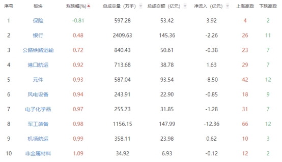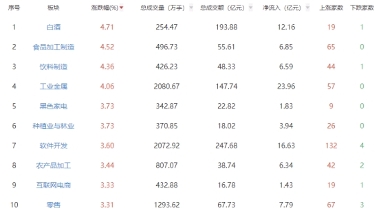 板块方面,白酒、食品加工制造、饮料制造等板块涨幅居前,保险板块跌幅居前。